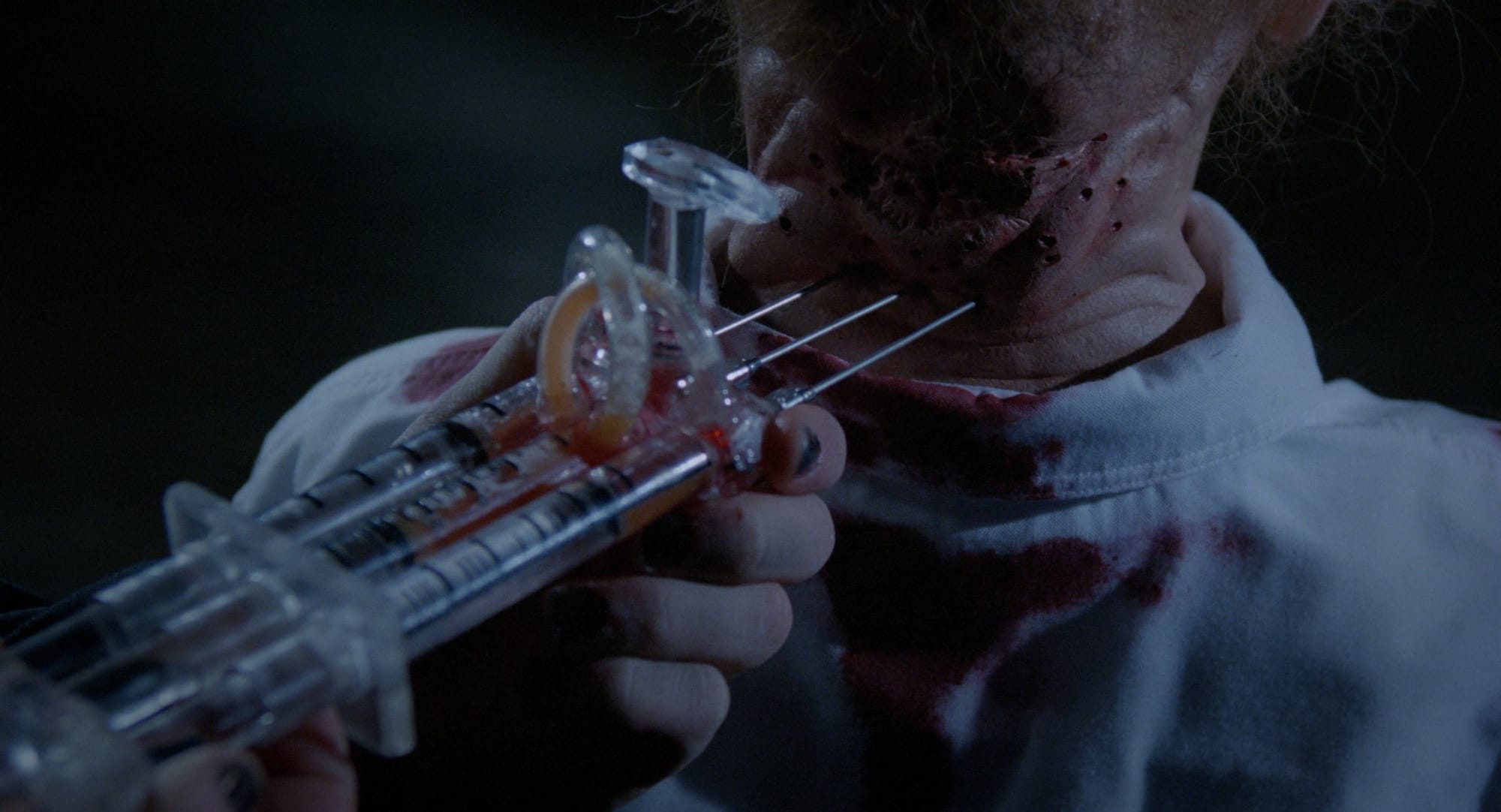 I have seen both cuts of Hellmaster. The apparently "more coherent" theatrical cut known as Them, and the DTV version that had scenes added and was re-edited. Neither of these cuts is easy to follow. This is a movie that begins with the "God is dead" quote by Nietzsche and then takes us everywhere from a handicapped kid having a crisis of faith to college students being menaced by a mutated man-boy who dresses like he's in a ska band. You will be witness to both the handicapped kid scream-crying the words "I'm a cripple!" and the weird man-boy being graphically injected in his mangled neck holes by a syringe of monster juice. There's something intoxicating about this flick though, in a way that reminds me of a disturbing half-remembered nightmare.