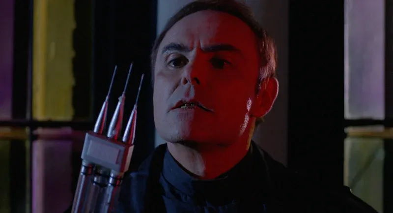 John Saxon is Professor Jones, a deranged eugenics-loving mad scientist trope who was presumably killed in the sixties in a college fire. The college has since been rebuilt and is now a weirdly mixed-media obsessed place of learning where people have pseudo intellectual conversations that make me want to swallow a bullet. Essentially a liberal arts college that's used to teach future FBI agents how to hunt a Longlegs or something. However, Professor Jones has returned to his old stomping ground as an even more deranged super-human, who uses a heroin needle super-soaker full of evil juice to control his growing army of weird mutated slaves that land somewhere between Cenobites and Deadites. Enter David Emge whose name you'll instantly forget so lets just call him Flyboy. Flyboy has a score to settle (Read: Dead wife) which he intends to do using a crossbow that fires syringes (They contain undiluted monster juice which is the only thing that can kill Saxon's creations... Look I didn't write this). He'll have to join forces with a bunch of dorky looking youths to stop...Well I guess he's calling himself the Hellmaster? Also the bully kid in this has a bullwhip, and one of the weird monster slaves has a nightstick that has a built in scythe, and when you become a zombie slave you get black fingernails and...
