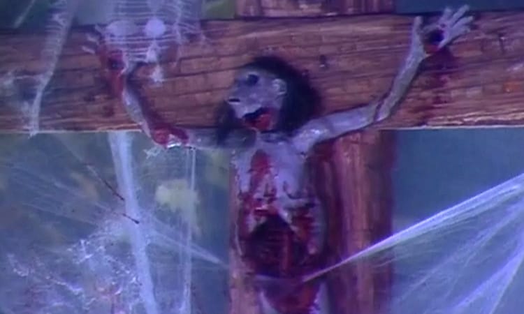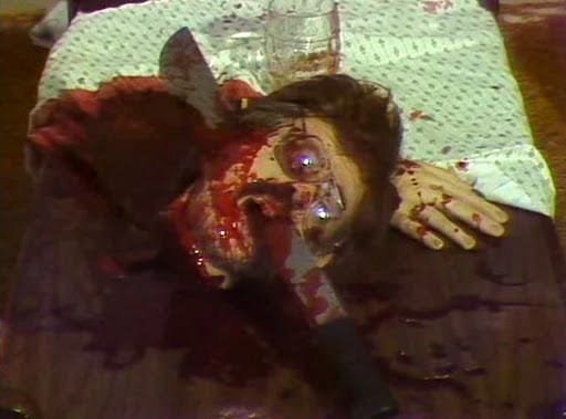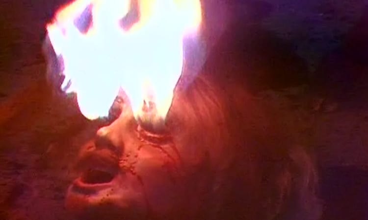 The Burning Moon is many things to me. It's a death metal demo with lyrics so filthy and riffs so ruthless that they threaten to warp the tape reel. It's a tincture of paint-red SOV gore sucked into a dropper and dripped into your eyeballs, an reverse Ludovico Technique that'll turn you into a celluloid sadist. It was also one of my earliest exposures to SOV and set far too high of a standard. Analog media dorks who've blown their life savings on every W.A.V.E. productions release would have you believe that SOV flicks are a rich tapestry of artistic creativity. Shut your pie holes. Maybe 20% of all the SOV movies released during their heyday are worth watching. Everything else is either barely-disguised fetish porn or mundane to the point of sedation. However Olaf ittenbach's diabolical anthology is far from whatever flavor of the week is fetching obscene prices on eBay. The only obscenity here is what's happening on screen...and thank German Satan for that.